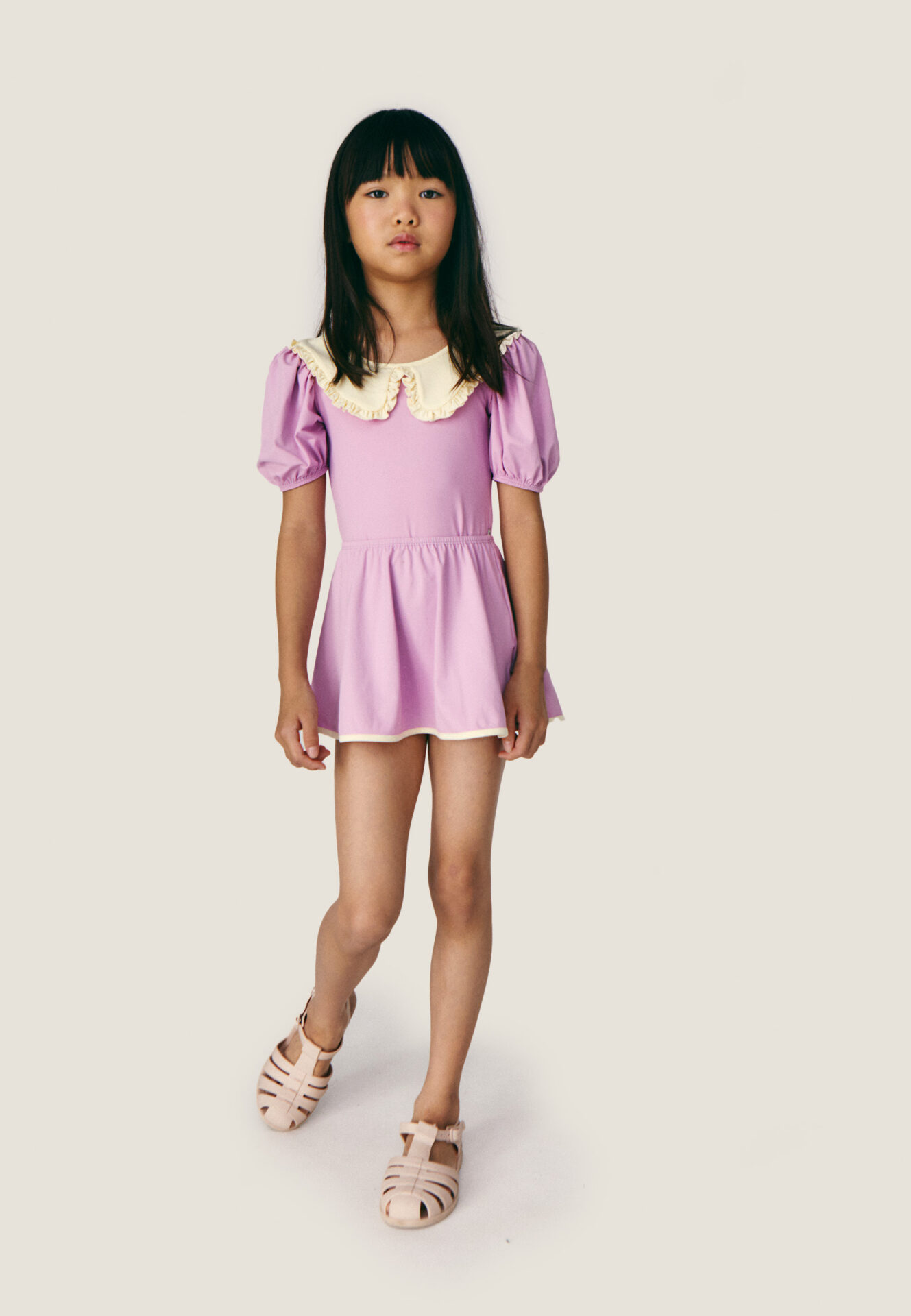 One of the most striking features of this swimsuit is the oversized collar, which adds a bold and fashionable statement to the overall design. This dramatic collar creates a unique look while maintaining a soft and feminine aesthetic that children and parents alike will appreciate.