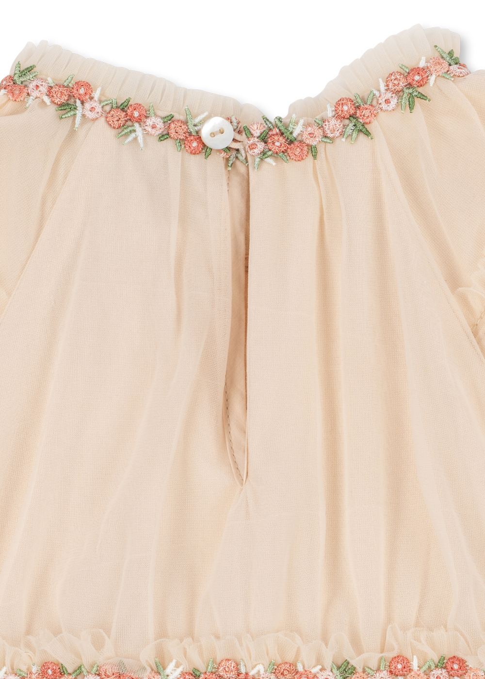 The Konges Slojd Joelle Tulle Dress is a beautifully crafted cream-colored dress designed for special occasions and elegant everyday moments.