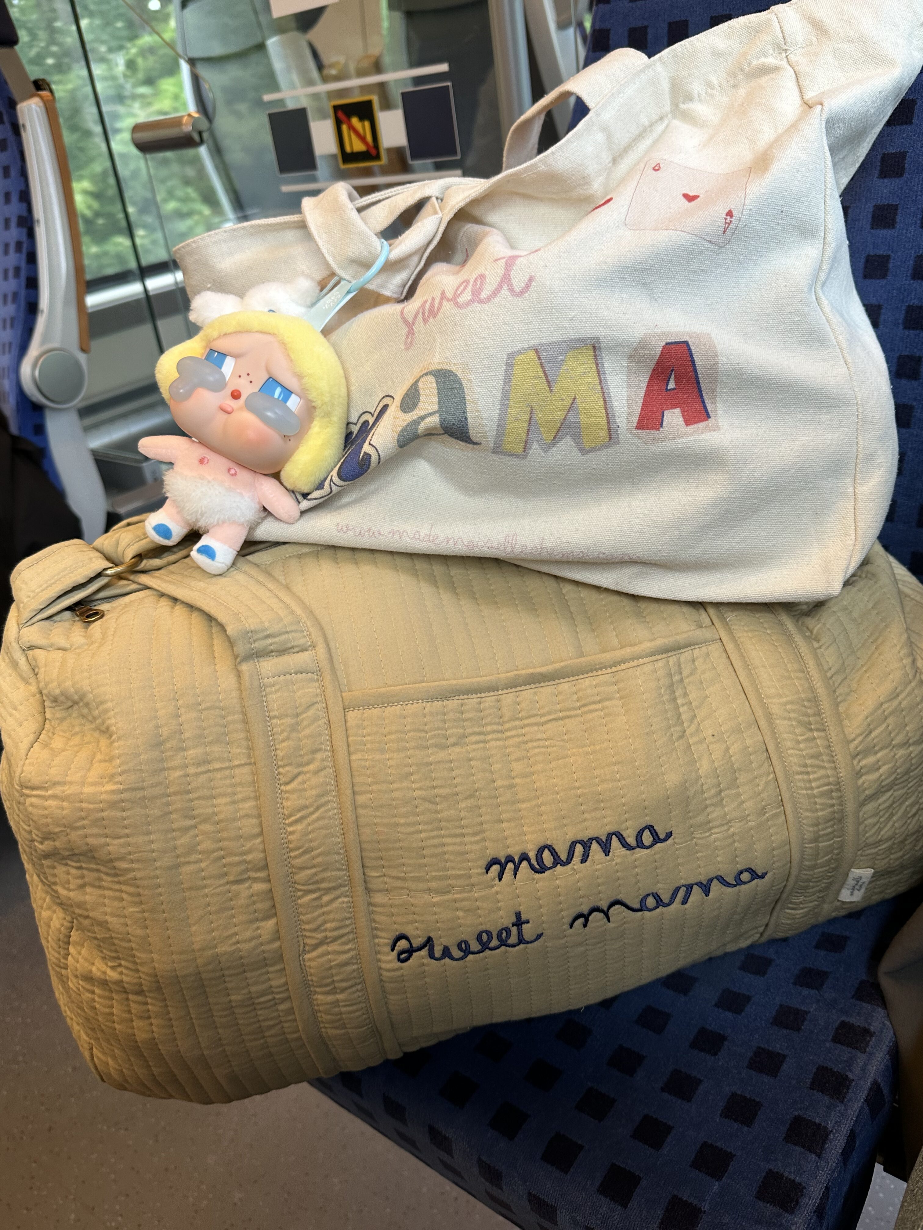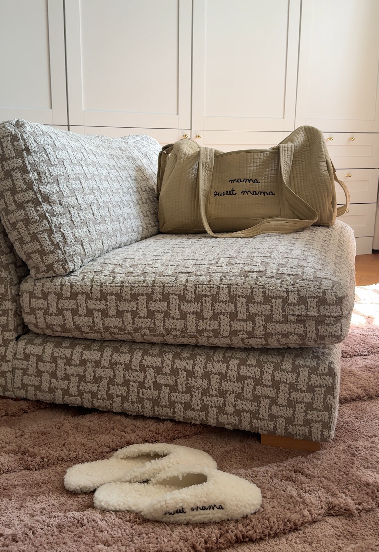 The Mama Sweet Mama weekend / hospital bag by Mademoiselle Chemsi is the perfect companion for motherhood journeys, from hospital stays to weekend escapes. This version comes in a timeless beige organic cotton with a beautifully hand-embroidered Mama Sweet Mama inscription in elegant navy blue thread on the front pocket.