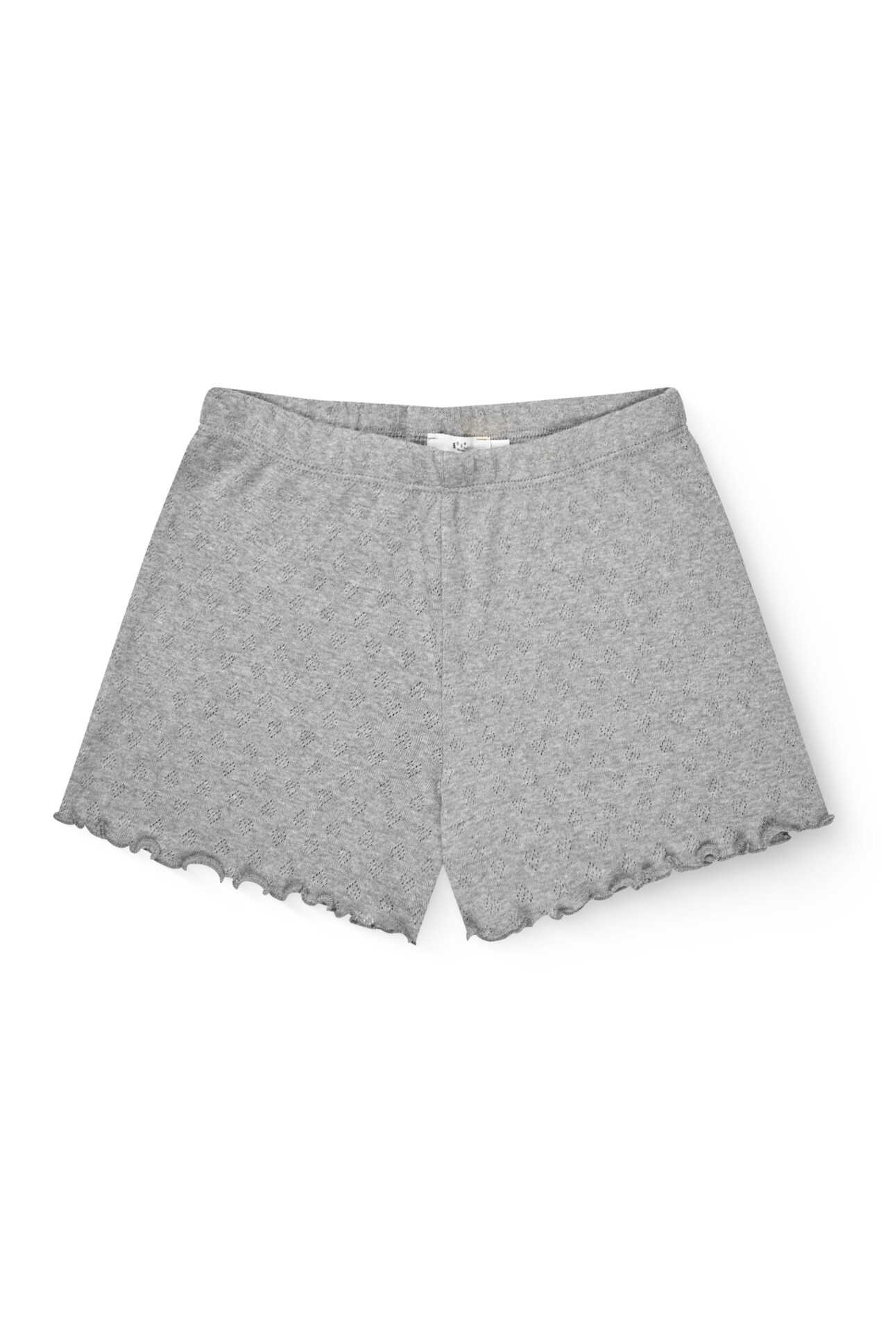 Designed with a light pointelle knit with small hearts, the shorts have a subtle textured pattern that adds charm and a playful touch. The elastic waistband ensures a secure yet comfortable fit, while the babylock edge at the hem creates a neat, summery look.