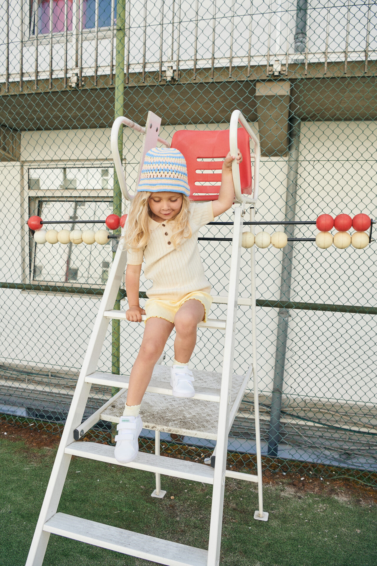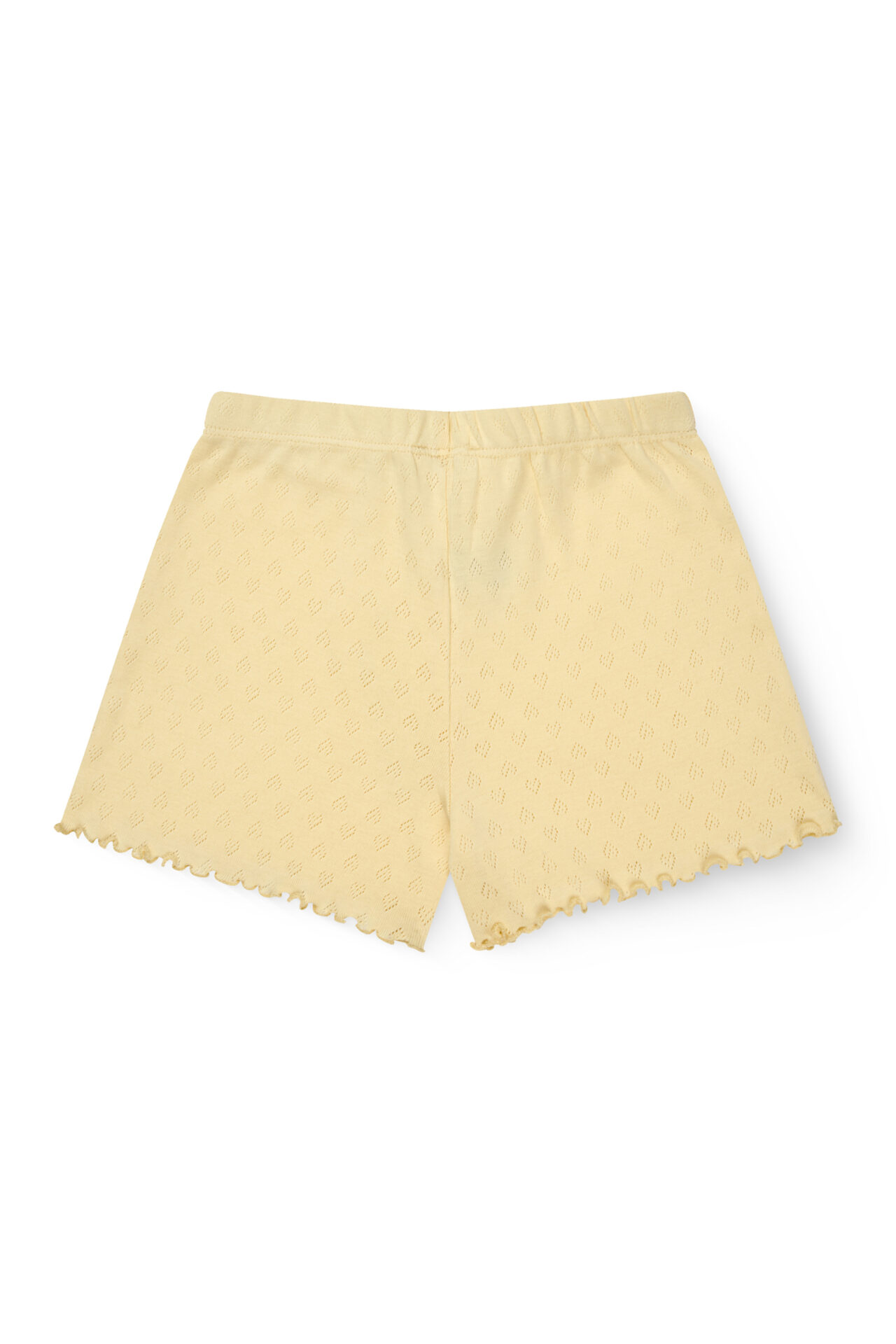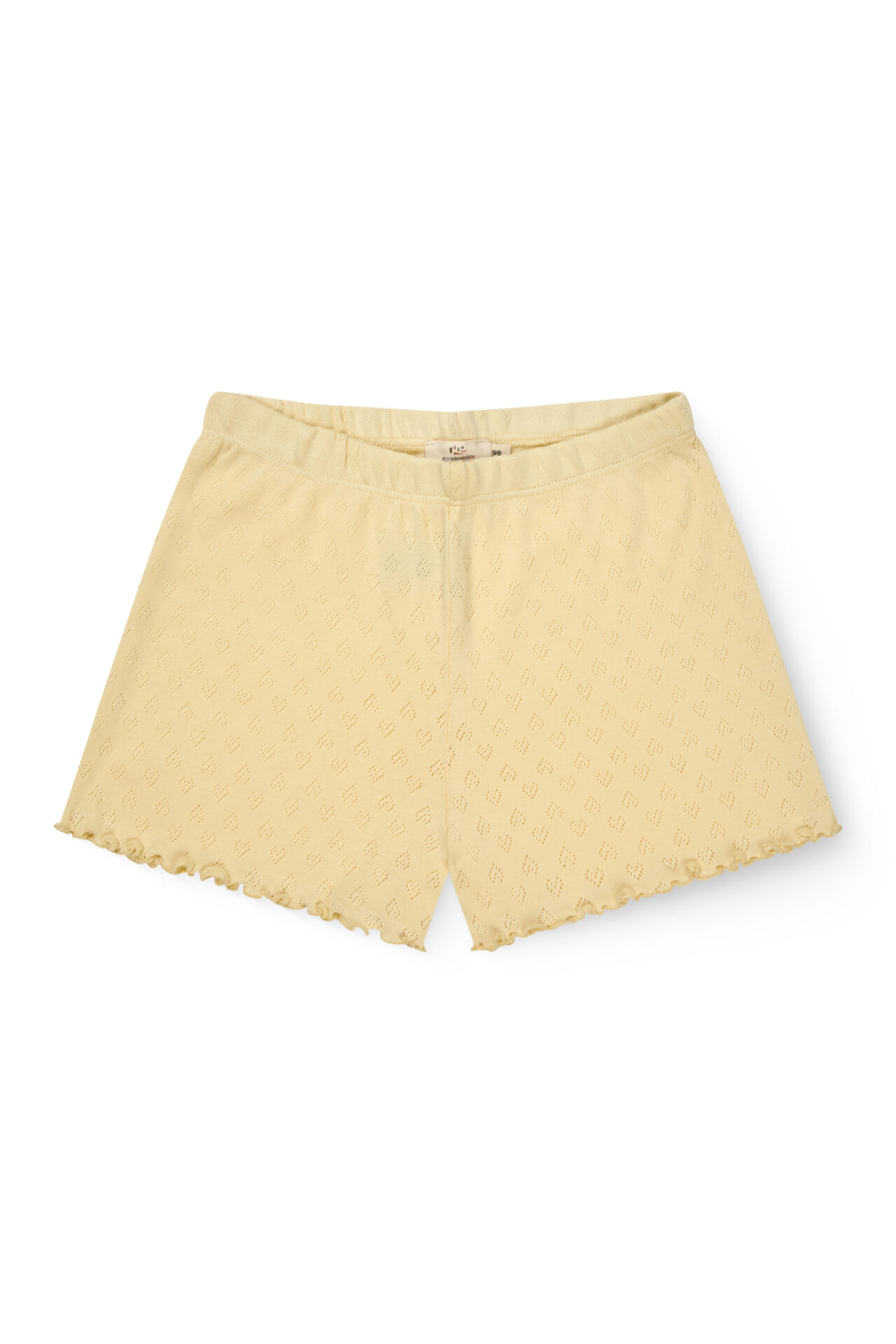 The soft pale yellow color adds a cheerful and fresh feel to any outfit. This gentle shade is easy to combine with t-shirts, blouses, or tank tops, creating comfortable and stylish summer outfits for children. These shorts pair perfectly with the Pointelle Heart T-Shirt for a coordinated look.